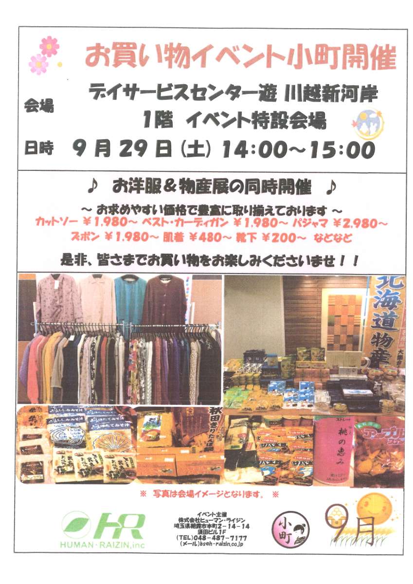 9月29日(土)デイサービスセンター 遊・川越新河岸の施設内にてお買いものイベントが開催されます!!