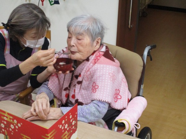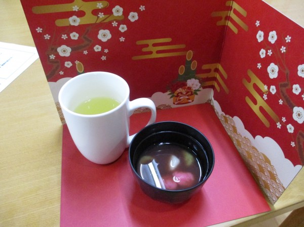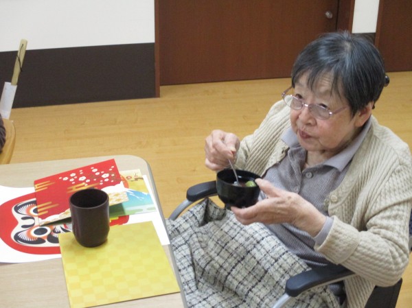 福笑いをして楽しまれたあとは、デザートのお汁粉を召し上がり