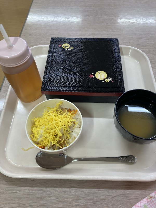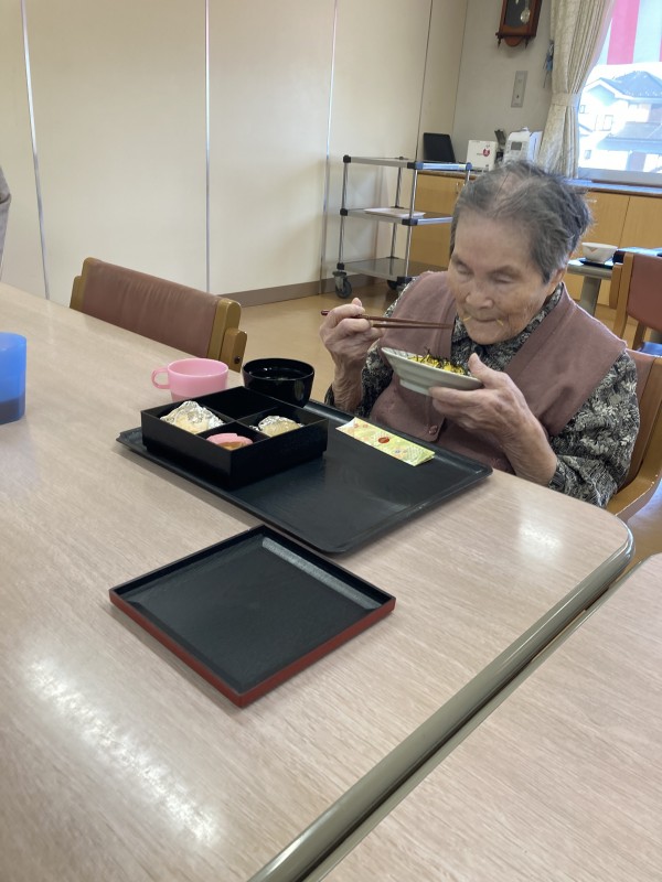元旦のおひるごはんの様子をご覧いただきます。美味しいおせち料理を更に美味しくするために、お膳に詰めていただきました。