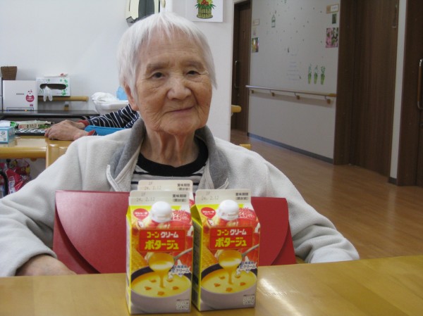 早速召し上がっていただきました。コーンスープをあっという間に飲み干されました(*^_^*)