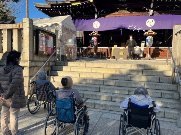 本堂までは階段があるので、車椅子の方のために門田ケアリーダーが代表して、お賽銭を投げます。
