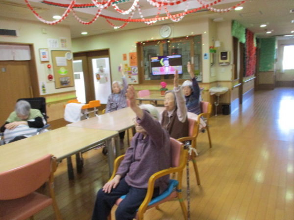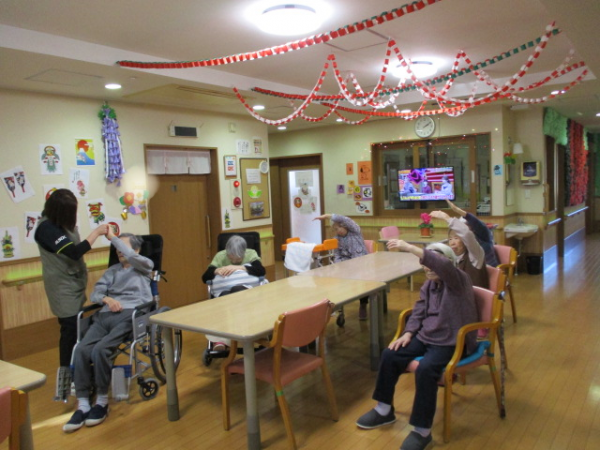 1階のご利用者様のご様子をお知らせします。毎月行っているリモート体操です(^^)/