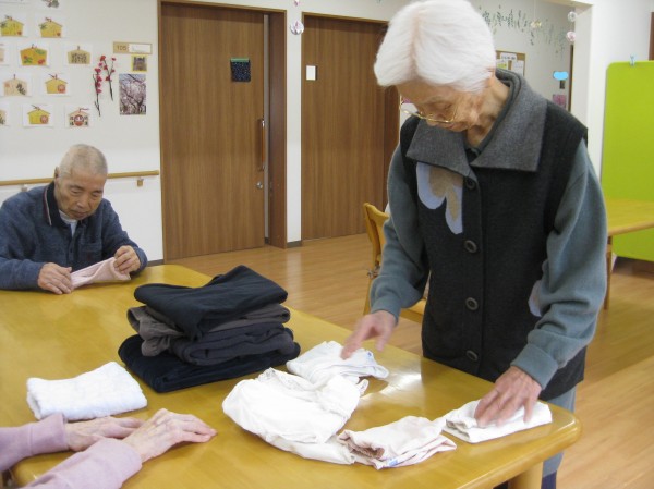 こんにちは! グループホームみんなの家・あきがせの介護ブログです! よろしくお願いいたします。 今日はお手伝い(お洗濯物畳に)のご様子をお知らせいたします!!