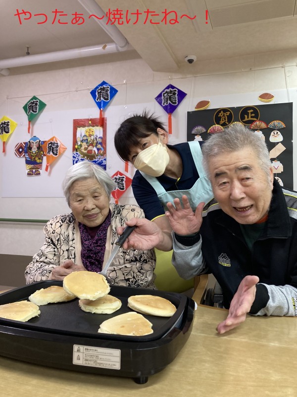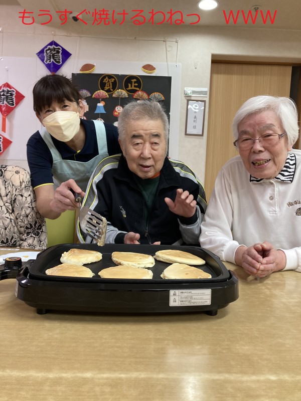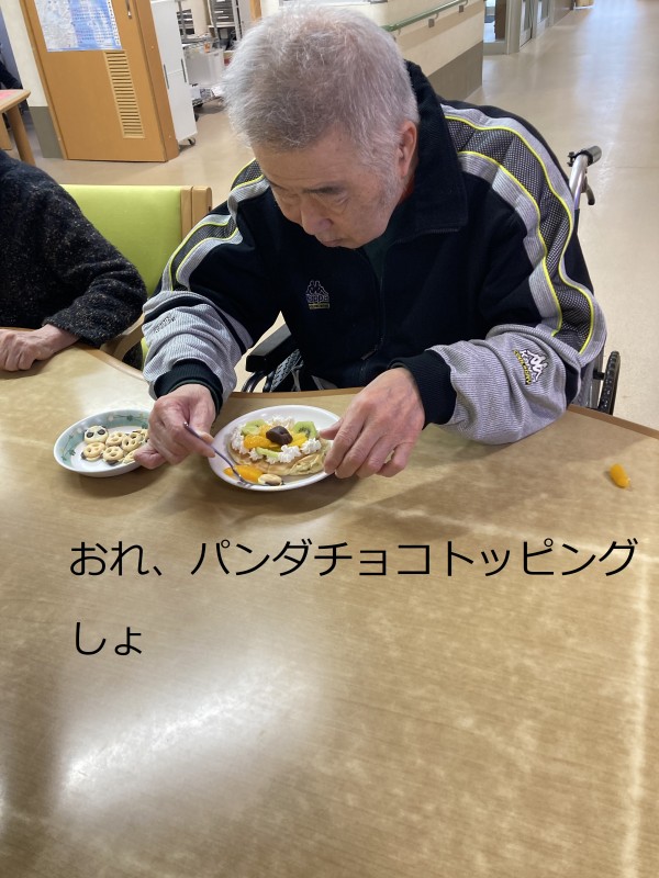 こんにちわ!おやつにパンケーキを作り利用者様にフルーツとぱんだチョコをトッピングして頂きました。
