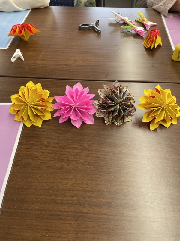 糊付けする箇所を間違えると花びらが開かず、難しく感じた方もいらっしゃったかもしれませんが、皆さんきれいなダリアの花を完成されていました。