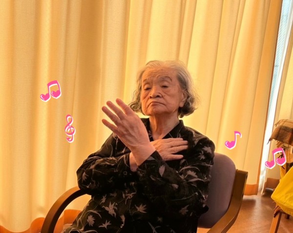 歌が好きな母様は、お顔をポンポンしながらリズムをとります
