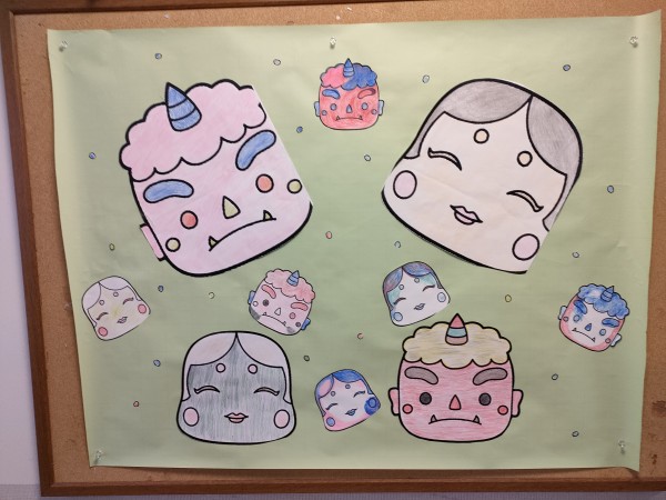 今回はもうすぐ節分!ということで2月の模造紙に鬼とおかめをみんなで作ってつけました!