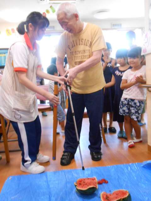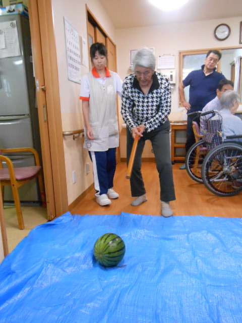 入居者様も負けずに、スイカ割に挑戦です☆