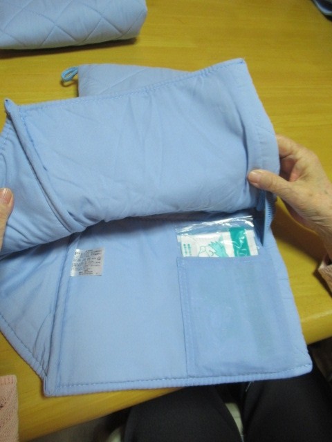 頭を守るように防災頭巾をお渡しして、