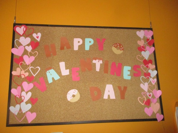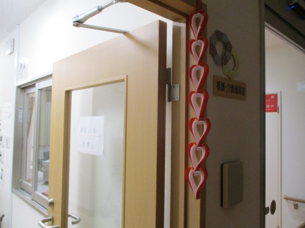 節分の豆まきも終わり、次はバレンタインです。 バレンタイン用の壁飾りを作りました。 事務所入り口もハートマークで飾りました。