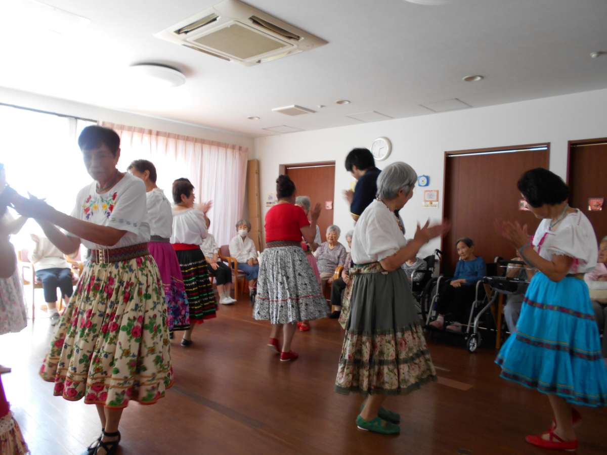 今月は「すみれ会」という10名のボランティアの方達が来て下さり、フォークダンスと民謡踊りを披露して下さいました。