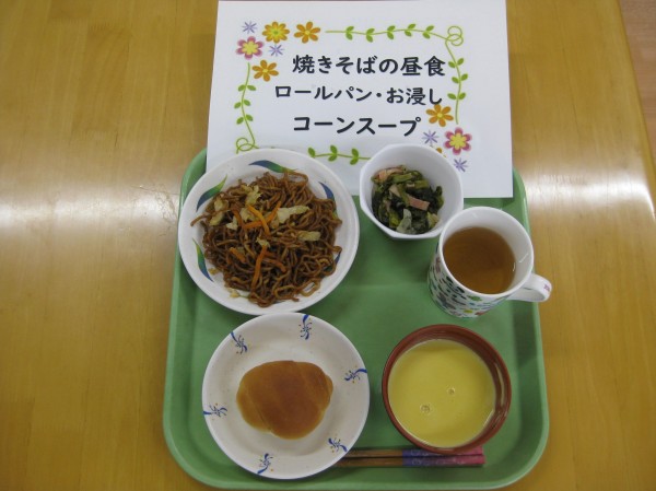 昼食のメニュー:焼きそば・ロールパン・コーンスープ・お浸しです( ^ω^)・・・