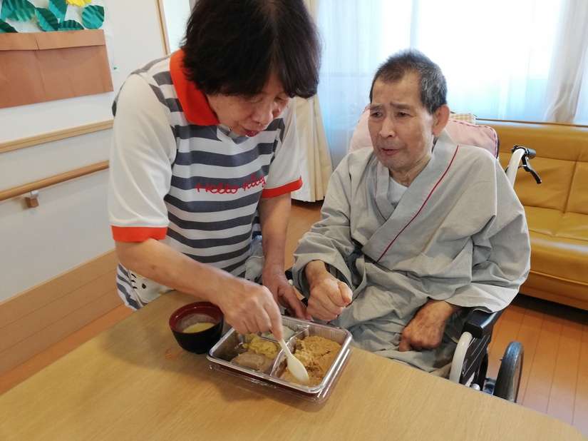食事形態は、常食・刻み・ミキサー食の3種類用意しました。常食では食べにくい方は、あらかじめ一口大にカットして提供しています。