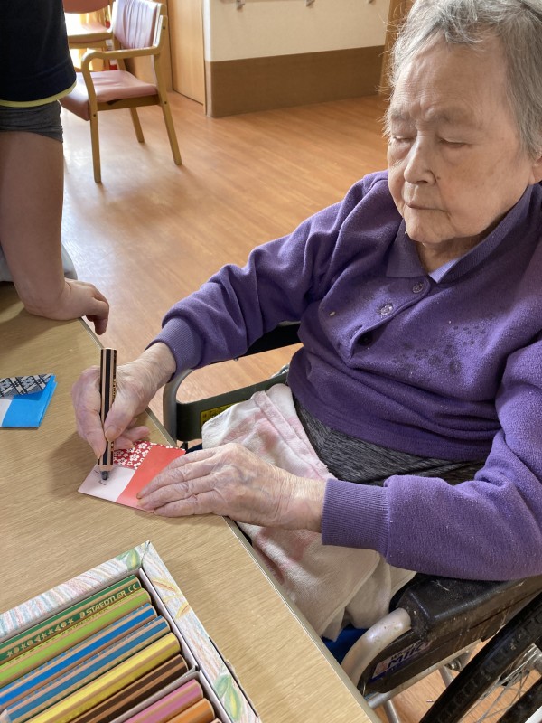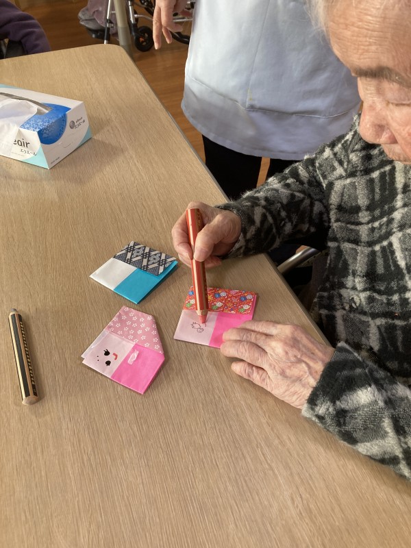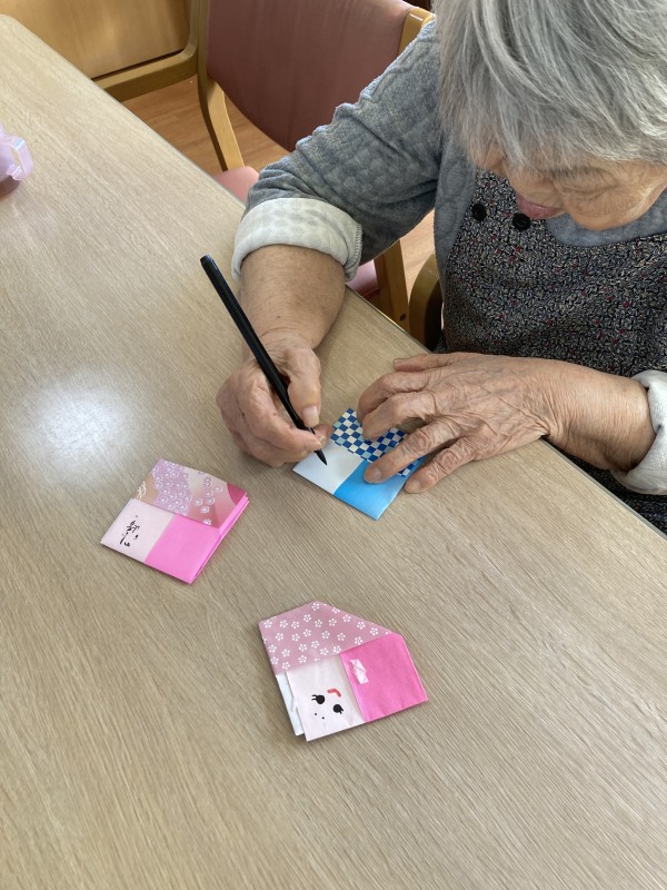 職員と一緒に折り、お顔を書いて頂きました。