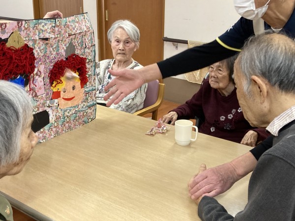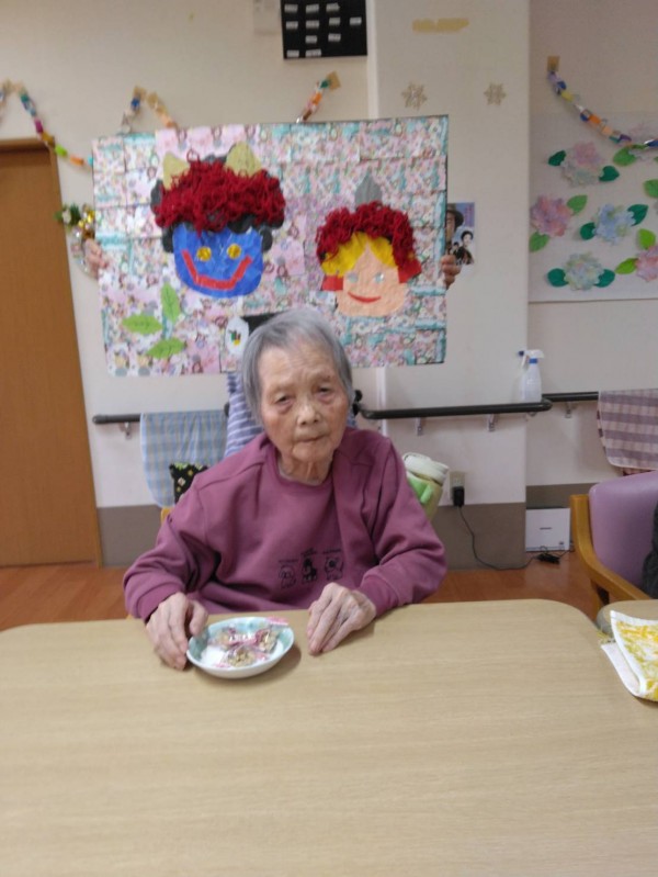 今年の節分は3階で作って頂いたかわいい貼り絵の鬼に、豆まきまたは記念撮影という形で行いました。