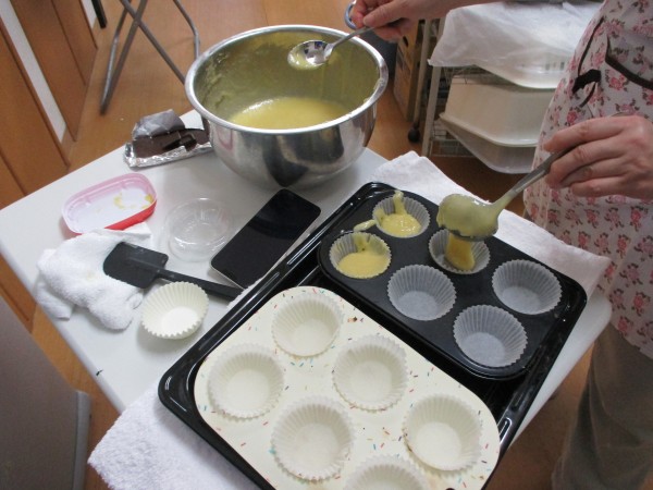 生地の中にチョコレートを忍ばせて焼いていきます!!!!マフィンの上にはクッキーが乗っていますね♡