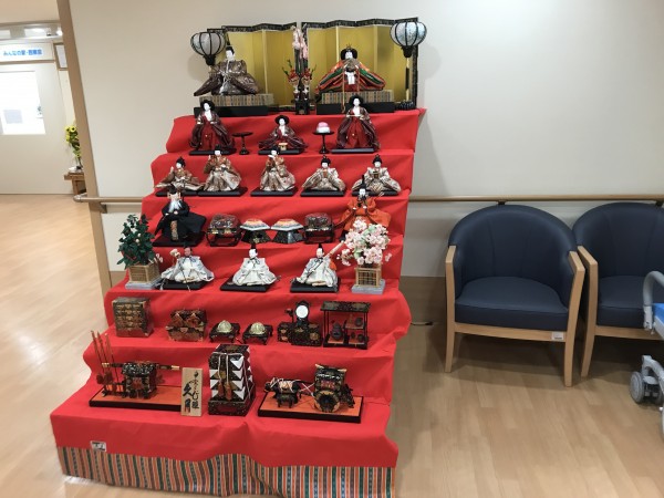 毎年ひな壇を2つ飾っています♪似ていますが、よく見るとちょっと違っていますね!実はひな壇の傍は、食事の台車の通り道でもあり毎回ドキドキしながらワゴンを動かしています!