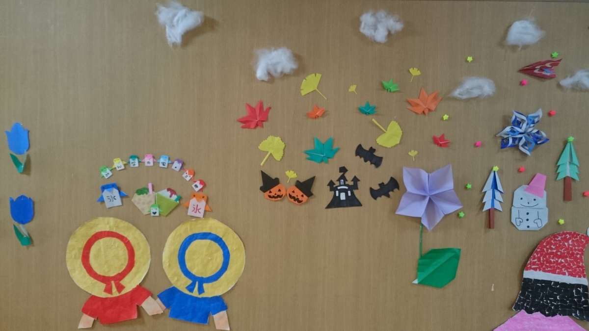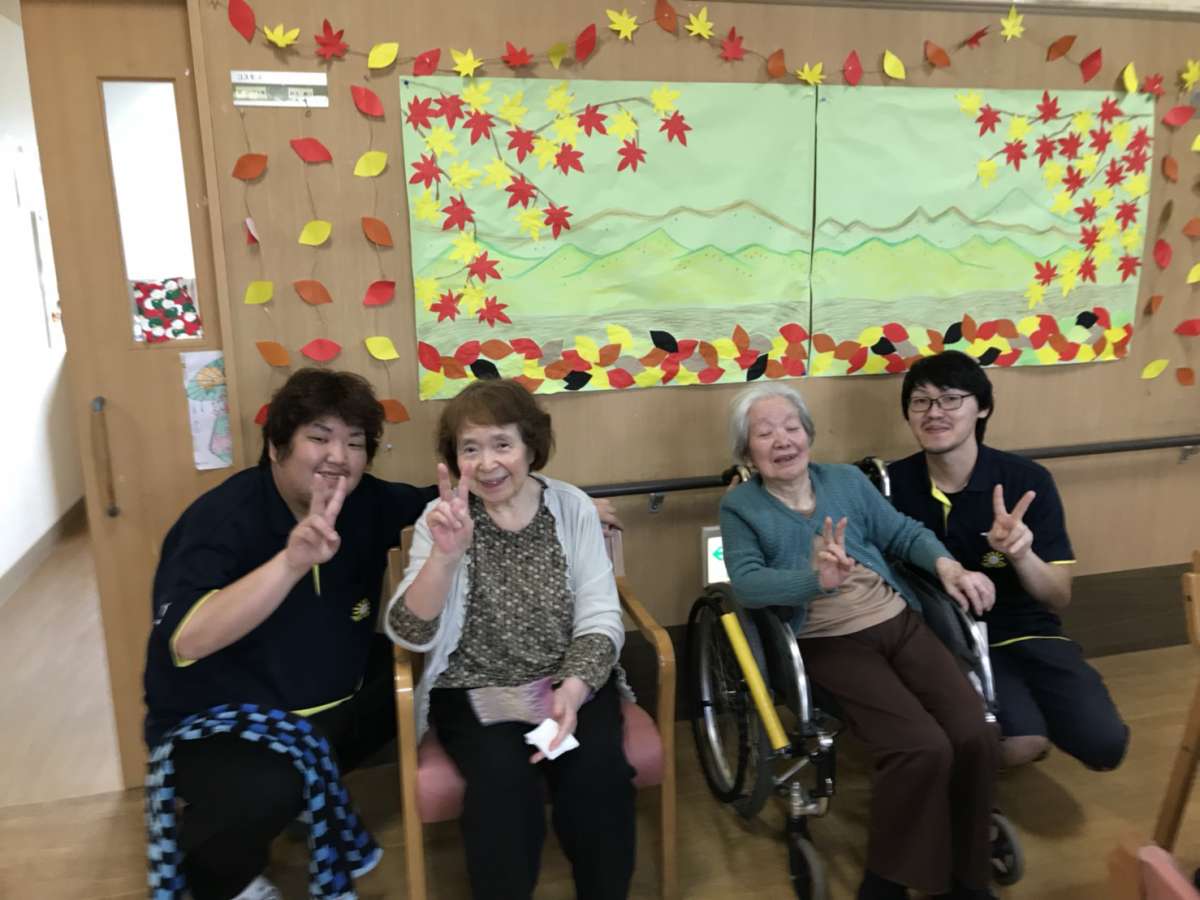 三郷では,最近製作レクリエーションが盛んです。紅葉の葉っぱをご利用者様に製作していただき,大作が出来上がりました。