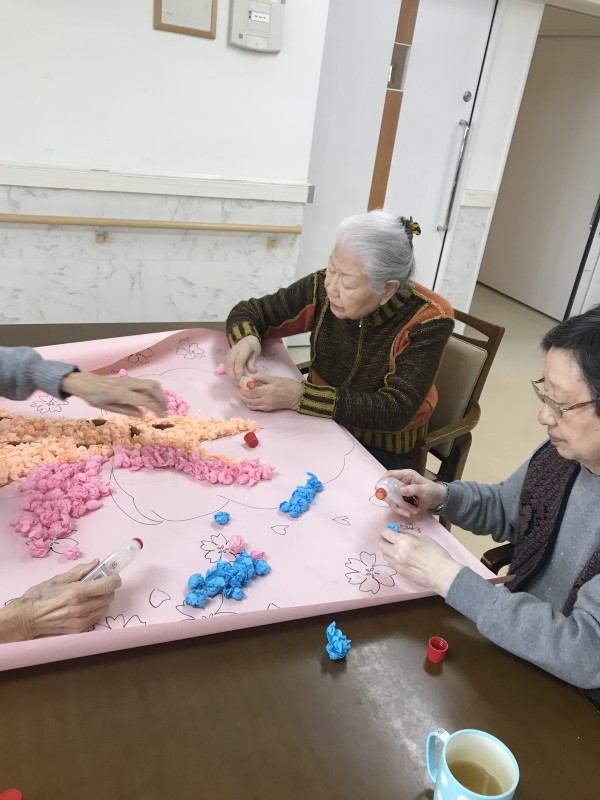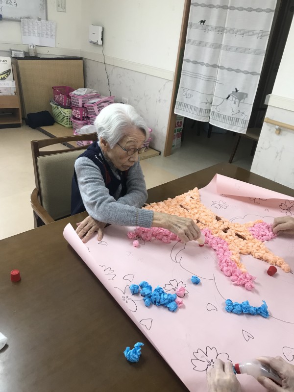 皆様に手伝っていただき、春に向けての壁画を作っています♡
