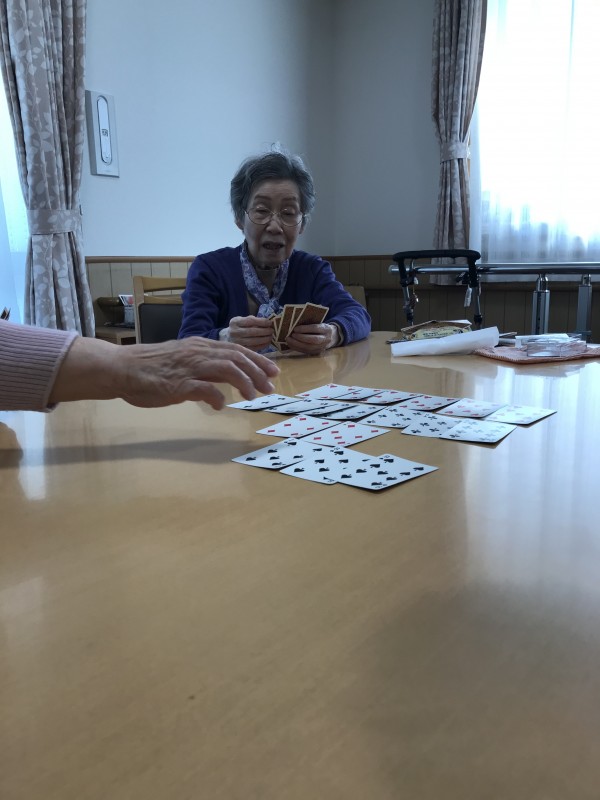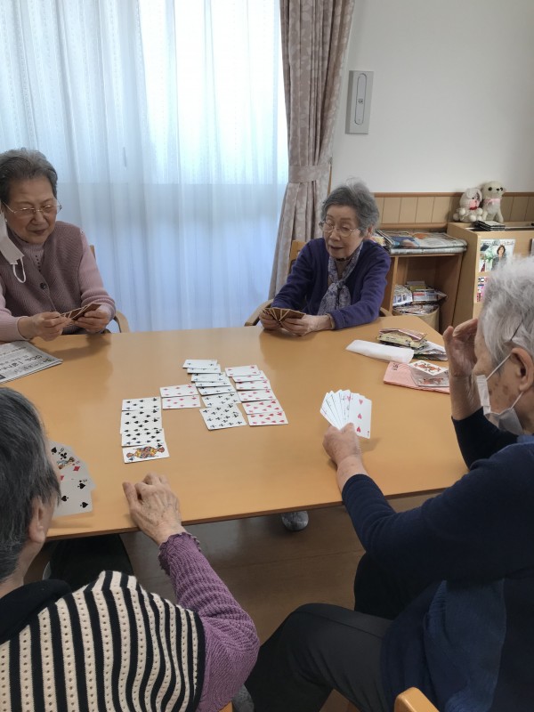いつも仲の良い4名の入居者様が久しぶりに会えることになり、久々にトランプ遊びをしていらっしゃいました。
