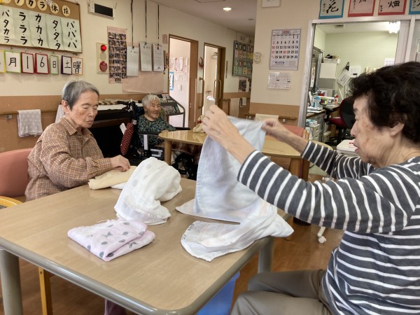 入居者様にあったレベルで洗濯物たたみ、食器拭き(お手伝い)をしていただいてます。日によって身体の調子に波があるので様子を見ながらいつもお願いしております。