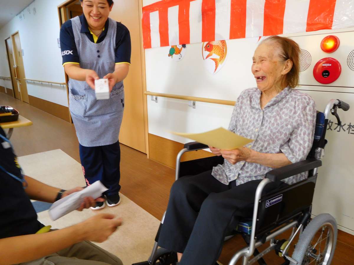 代表して3名のご入居者様(うちには百歳の方が3名もいらっしゃいます)に受け取っていただきました。