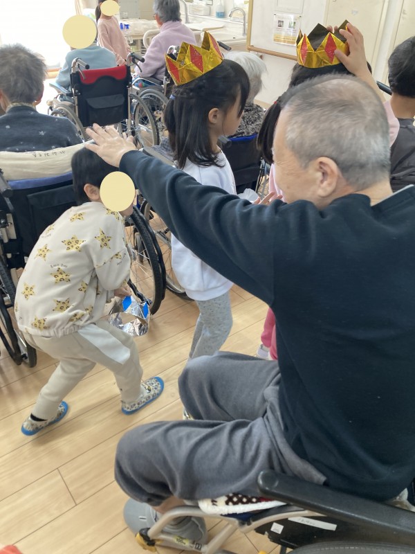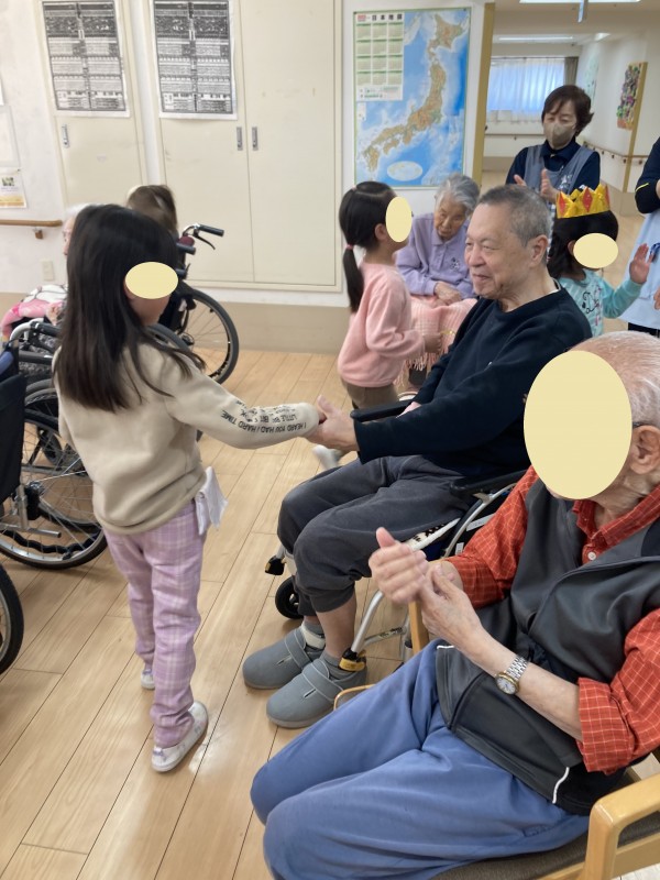 利用者様と園児たちと手をつないだり、プレゼント交換したり、