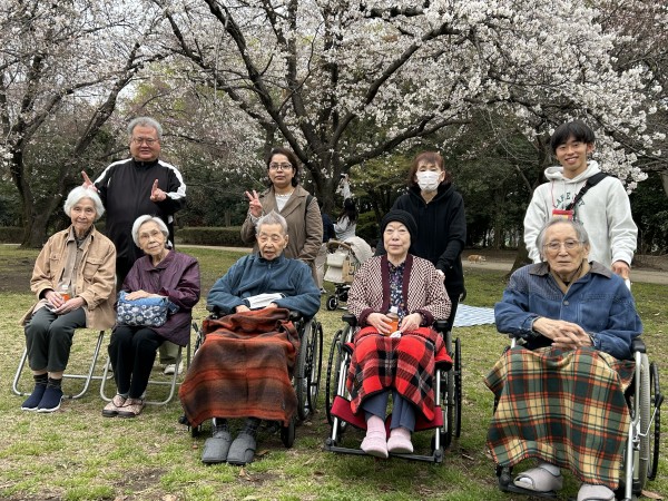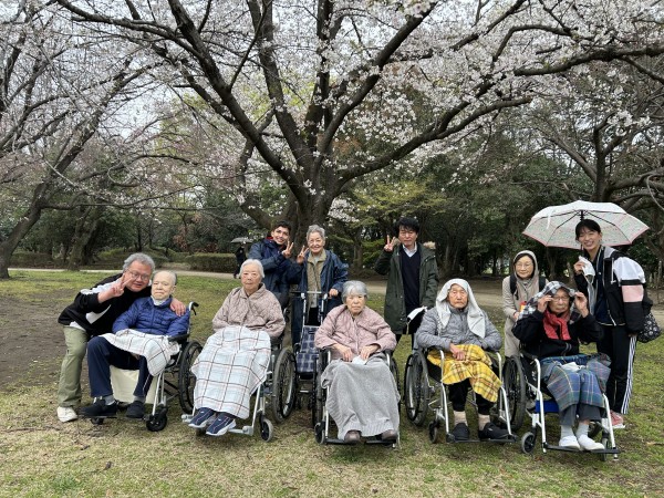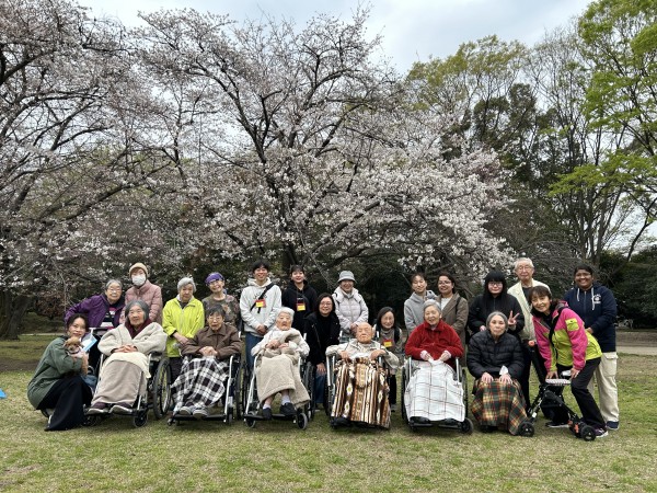 最後の班の皆さんは雨が降ってしまい思うようにお花見が出来ず残念でしたが、屋根の下からの桜を眺め、職員の連れて来たワンちゃんと戯れていました。