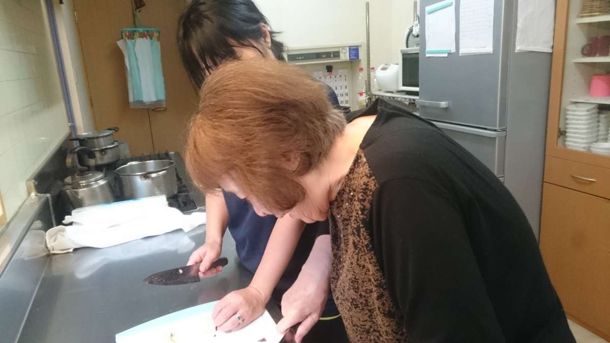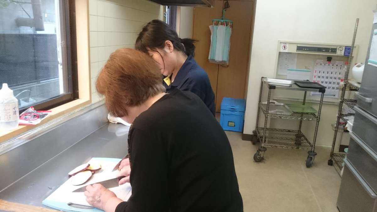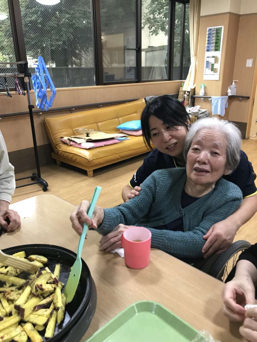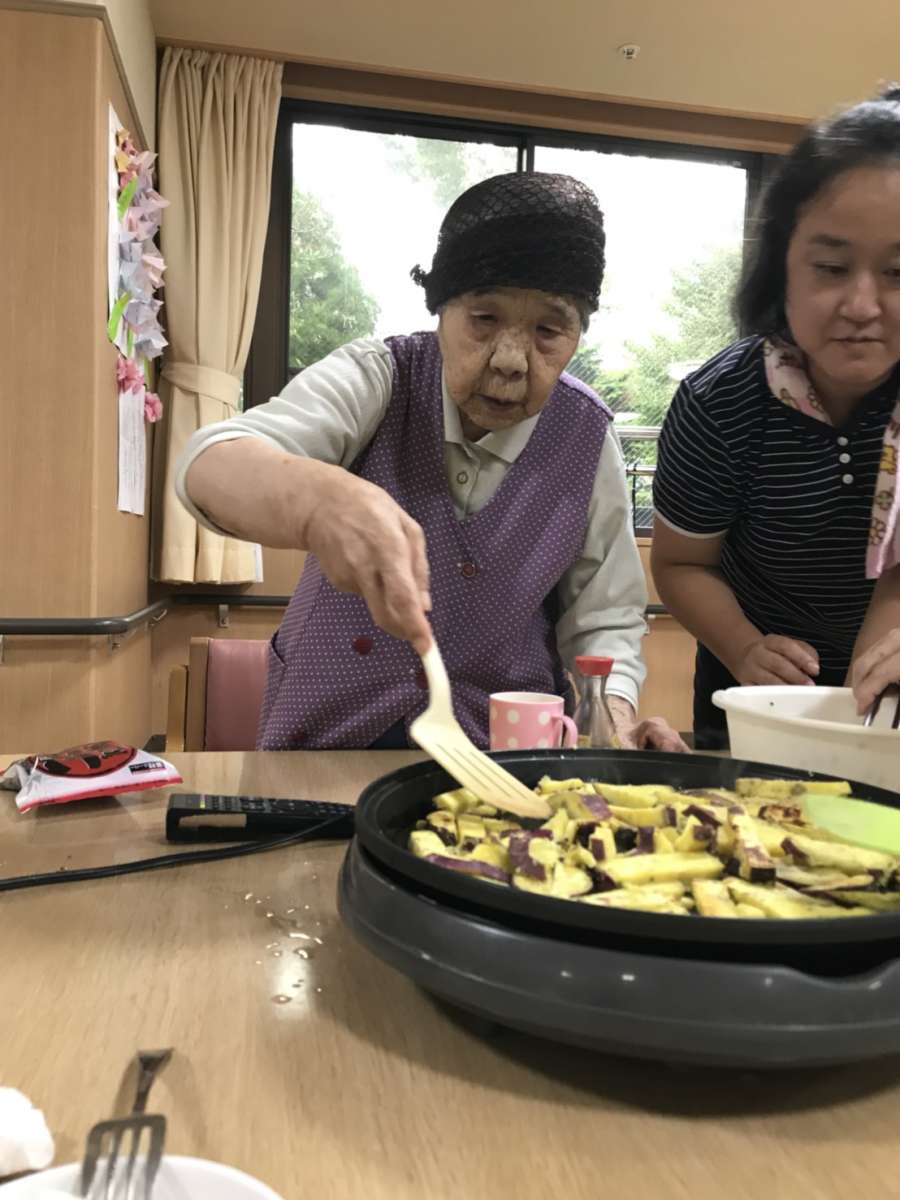 手先が器用なご利用者様に芋のカットをお願いし、その後ホットプレートで炒めました。