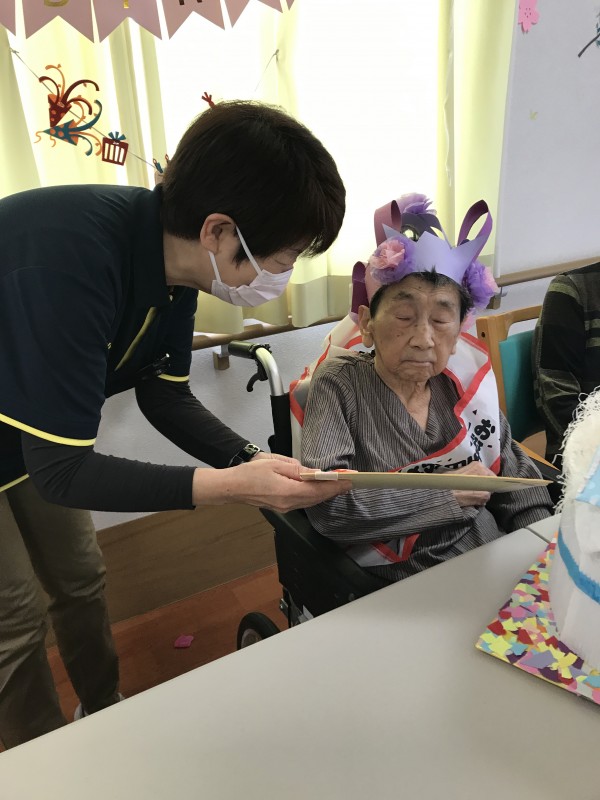 お誕生日席につき、王冠をかぶって頂き、タスキを掛けます♪