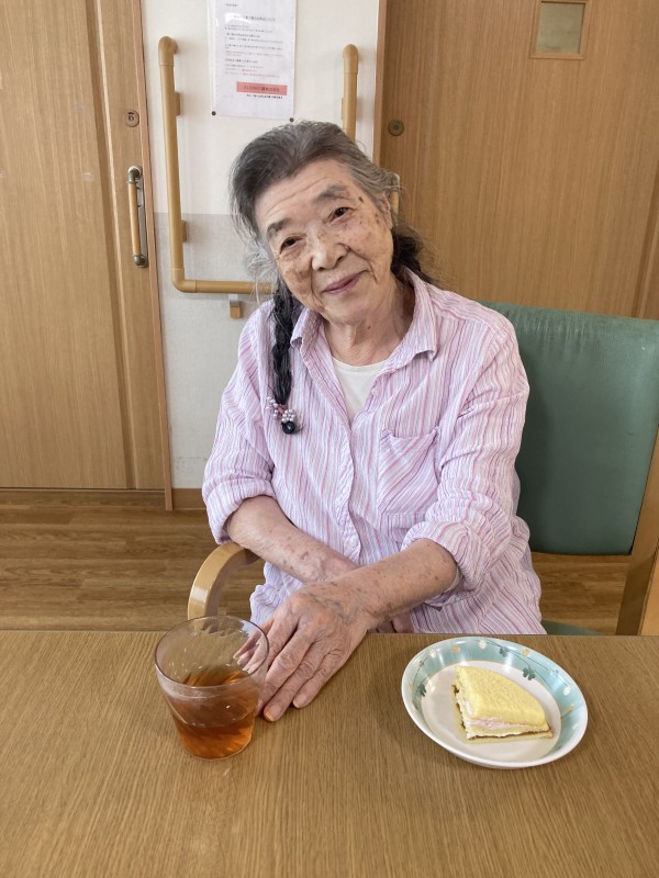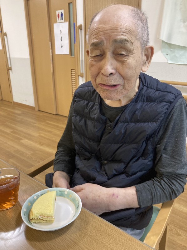 本日のおやつは御家族様のご厚意により頂いたイチゴのスポンジケーキです。