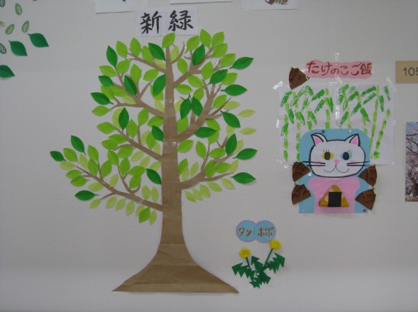 桜も終わり、新緑に季節になりました。新緑の貼り絵、壁画を作りました( ^ω^)・・・