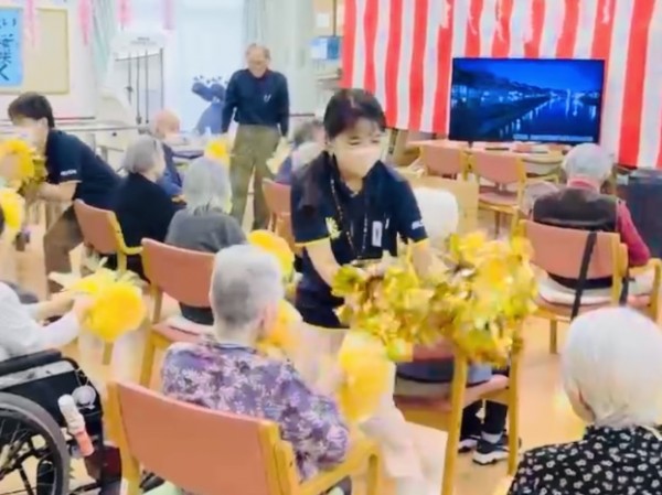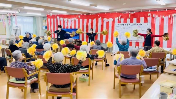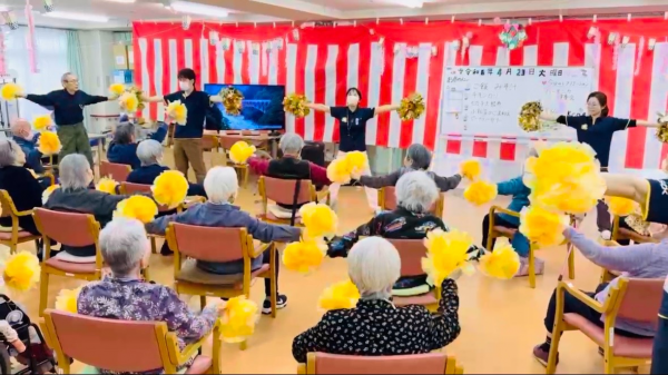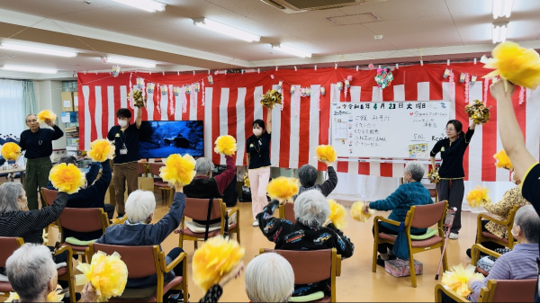 ダンスは機能訓練士が考案して、BGMに合わせてポンポンを使って楽しく身体を動かします♪ちなみにポンポンはご利用者様が制作しました(*^▽^*)