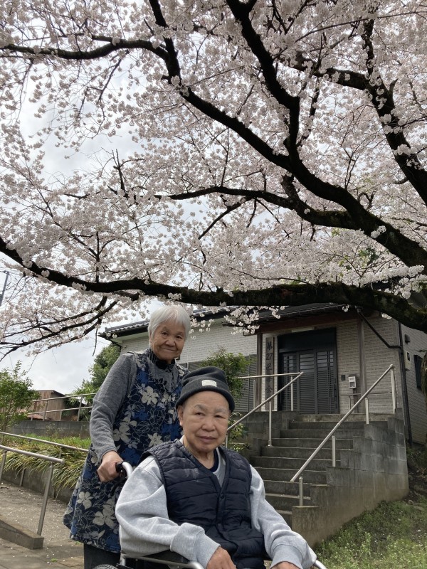 満開の桜の下で、入居者様たちと記念撮影をしました。