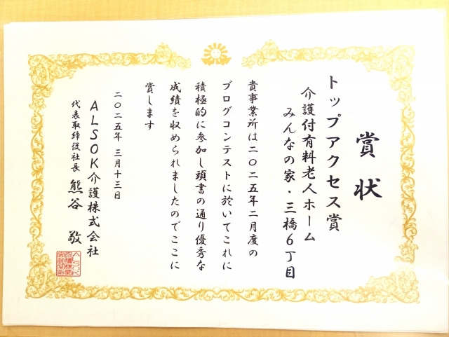 ★☆三橋6丁目がトップアクセス賞で賞状授与♪優秀な成績を収められたのでここに賞します!!2025年令和7年✨ 『みんなの家 三橋6丁目 介護ブログ』☆★