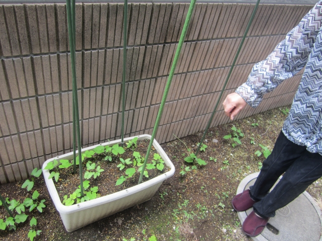 ★☆園芸部大活躍!朝顔(アサガオ)の育て方!('ω')ノ 朝顔(アサガオ)の種まき後、4週間程で支柱を立てて、つるが折れないように誘引してあげる♪(^^♪ 『みんなの家・三橋6丁目』☆★