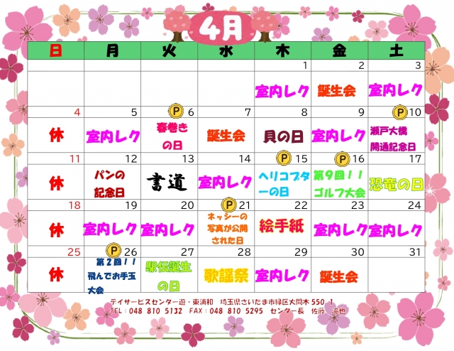 4月のレクリエーションカレンダーが完成しました(^_-)-☆