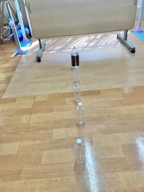 今日のレクは、ボトル倒しです。