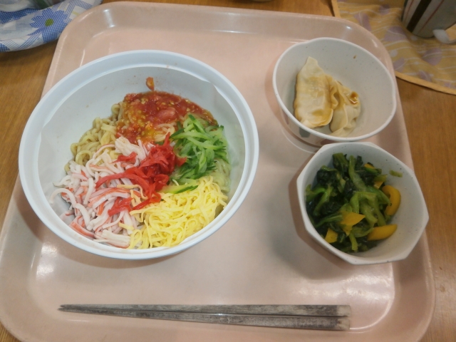 9/1 お昼は冷やし中華と餃子でした。外は雨。いよいよ秋めいてきましたでしょうか?②