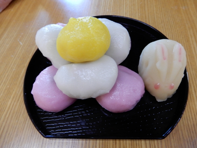 十五夜のお月見の日。お月見饅頭です。皆様色とりどりの餅を見て、かわいい、綺麗と言われています。おいしいねと味わっていました!
