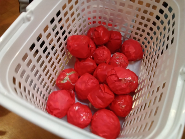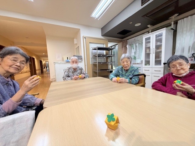みんなで折り紙。秋は柿!作って膨らます段階であれ?膨らまし方忘れちゃったかな?風船を膨らますって難しいですよね。お手伝いして何とか柿が出来ました。良かったですね。