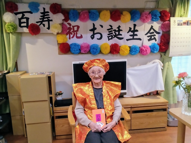 グループホームみんなの家・中野鷺宮で8月のお誕生会で「百寿」のお祝い