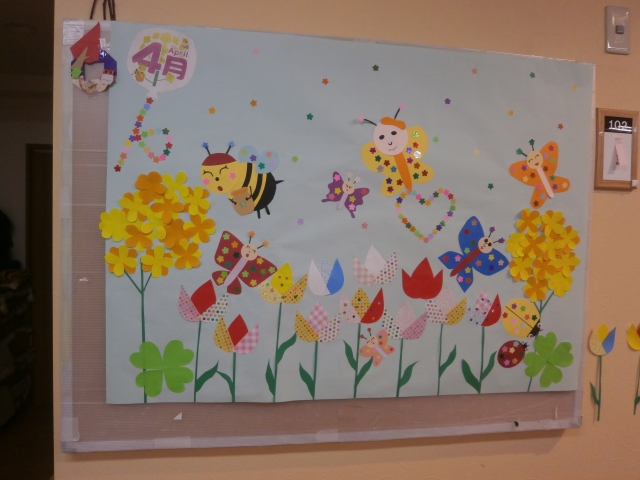1階の壁絵が春真っ盛りになりました。みんなで目や鼻を貼って作ったんですよ。どうでしょう。