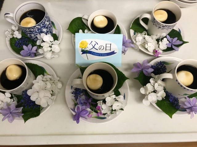 父の日。母の日に負けないくらいのおやつレクです。コーヒーがお好きな方が多いので、コーヒーフロートにしてみました。今の季節にぴったりの紫陽花を添えて。とってもきれいでおいしい!!