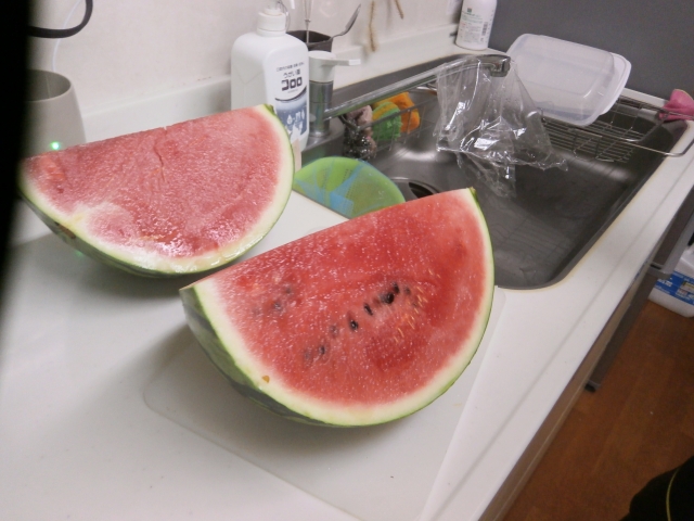 今日は朝から夏祭りモード。まずは10時にスイカ。赤いところがなくなるまでかぶりついてましたね。①