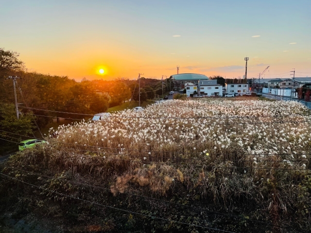 すすきが原のかなたに沈む夕日を望む