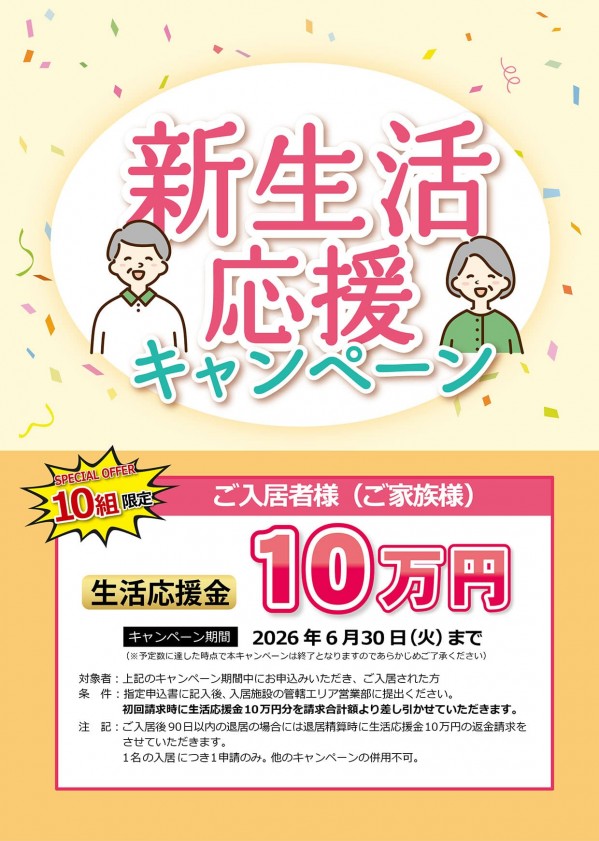 当社が運営する一部の介護付有料老人ホームにて、期間限定の「新生活応援キャンペーン」を実施いたします。キャンペーン期間中にご入居された方に生活応援金として10万円を進呈いたします。本キャンペーンは先着10組限定、対象期間は 2026年4月1日(水)~6月30日(火)まで となっております。新たな生活を始められる皆さまを応援する特別な機会となりますので、ぜひご活用ください。