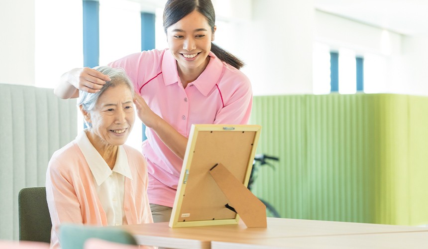 ALSOK介護が運営する認知症対応型グループホームでは、毎月1回、美容師が施設を訪問してヘアカットを行っています。スタッフブログには、「ヘアカットしてスッキリしてこようかしら」と嬉しそうに話されていたご利用者様の様子が紹介されており、カット後には「似合っているかしら?」「髪型がスッキリしてとっても若く見えるわよ」と、その場にいる皆さんの会話もはずんでいた様子が綴られています。美容ケアがひとりひとりの笑顔をつくり、コミュニケーションを生む場になっていることが伝わってきますね。
