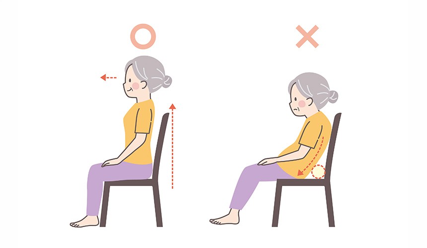 骨盤が後ろに倒れると、胸が圧迫されて呼吸が浅くなります。また、あごが上がったり、逆に首が垂れ下がったりすることで、飲み込みの機能が低下し、誤嚥(ごえん)を引き起こす恐れもあります。