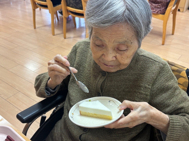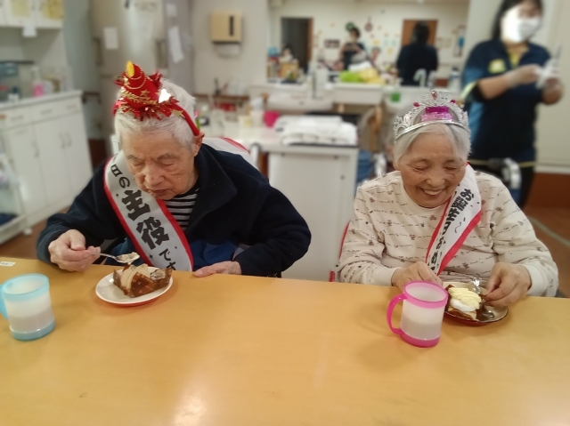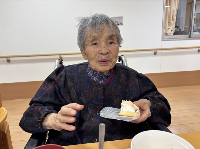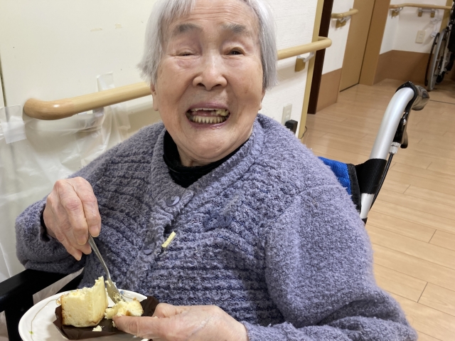 毎月誕生日会では、誕生日の方のご希望でうなぎや、ハンバーグ、お寿司などお好きなお食事をご用意してお祝いしています。もちろんケーキも用意いたします!甘いものは別腹ですものね。